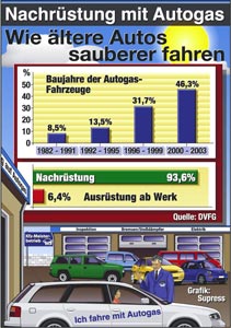 Diese Chance zum Sparen und zur nachträglichen ökologischen Aufwertung der Fahrzeuge wird allmählich auch in Deutschland genutzt. Das zeigt eine aktuelle Umfrage des Deutschen Verbandes Flüssiggas e. V. (DVFG). Danach handelt es sich bei 93,6 Prozent aller deutschen Autogas-Fahrzeuge nicht um Werksausrüstungen, sondern um Nachrüstungen bereits zugelassener Autos. Dies ist auch der Grund dafür, dass in den offiziellen Bestandszahlen des Kraftfahrtbundesamtes stets nur ein Teil der inzwischen mehr als 18.000 Autogas-Fahrzeuge in Deutschland auftaucht. Die bisweilen aus diesen Statistiken abgeleitete, vermeintlich langsamere Entwicklung etwa gegenüber den erdgasbetriebenen Fahrzeugen existiert also nur auf dem Papier, nicht real auf der Straße.