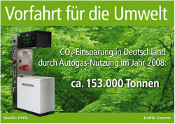 Und auch die Umwelt profitiert: Nach Anhaben des Deutschen Verbandes Flüssiggas e. V. (DVFG) ersparte die Nutzung von Autogas allein im Jahr 2008 unserer Luft rund 153.000 Tonnen an CO2-Emissionen. So viel höher wäre der Schadstoff-Ausstoß nämlich ausgefallen, wenn sämtliche autogasbetriebenen Fahrzeuge im gleichen Zeitraum herkömmliche Kraftstoffe verbraucht hätten. Ein beträchtlicher Beitrag zur Emissionsminderung also, an dem sich jeder beteiligen kann – sowohl durch den Kauf eines Autogas-Neuwagens als auch durch die Nachrüstung des bestehenden Fahrzeugs.