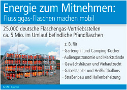 Das leitungsunabhängige Gas ist für diese Anwendungen in Flaschen mit einem Füllgewicht von fünf, elf oder 33 kg erhältlich. In Deutschland stehen für die mehr als fünf Mio. im Umlauf befindlichen Flüssiggas-Pfandflaschen rund 25.000 Flaschengas-Vertriebsstellen zur Verfügung. Camping- und Caravan-Fans schätzen das transportable Gas als Reise-Energie, in der Außengastronomie versorgen die Flaschen beispielsweise Grillstände, Mandelröstereien und Terrassenstrahler. Gärtnereien beheizen mit dem Flaschengas die Gewächshäuser, landwirtschaftliche Betriebe nutzen es für Wärme bei der Viehaufzucht und der Getreidetrocknung.