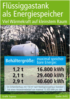 Wegen der hohen Energiedichte von Flüssiggas gelten diese Tankbehälter als ideale Energiespeicher, die auf kleinstem Raum enorm viel Wärmekraft für Heizung und warmes Wasser bereithalten. Schon der kleine Behältertyp für ein Nenn-Füllgewicht von 1,2 Tonnen kommt auf eine maximal speicherbare Energie von 16.800 Kilowattstunden – bei gerade mal 2,5 Metern Länge. Der Tanktyp für 2,1 Tonnen enthält bereits bis zu 29.400 Kilowattstunden, der große 2,9-Tonnen-Tanktyp sogar 40.600 kWh. Gewaltige Speicherkapazitäten also, die in Verbindung mit der energieeffizienten Betriebsweise moderner Gasheizungen oftmals für weit mehr als eine Heizperiode ausreichen. Da bleibt dann genügend Spielraum, um für die Nachbestellung den unter Kostenaspekten günstigsten Zeitpunkt abzuwarten.
