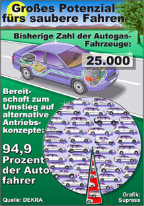 sup. - Steigende Benzinpreise, alljährliche Smog-Warnungen und der Wirbel um die Feinstaub-Problematik haben mittlerweile so manchen Autofahrer ins Grübeln gebracht. Während sich die meisten bisher außer Benzin oder Diesel keine andere Kraftstoffart für ihre Mobilität vorstellen konnten, geraten allmählich auch die schadstoffärmeren Alternativen in den Blickpunkt. Kein Wunder, wenn man bedenkt, dass beispielsweise ein Liter Autogas an der Zapfsäule wegen der günstigeren Besteuerung nur rund halb so viel wie Benzin kostet. Mehr als 25.000 Fahrzeughalter haben ihr Auto mittlerweile mit einem zusätzlichen Flüssiggas-Tank ausrüsten lassen und schonen dadurch ihre Kasse sowie die Umwelt. Und offensichtlich gibt es unter Deutschlands Fahrern eine starke Tendenz, diesem Vorbild zu folgen: 94,9 Prozent sind grundsätzlich bereit, auf einen alternativen Antrieb umzusteigen. Zu diesem Ergebnis gelangt eine bundesweite Umfrage der DEKRA unter Autofahrern, die mit ihrem Fahrzeug zur regelmäßigen Hauptuntersuchung kamen.