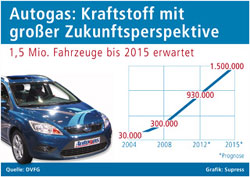 Prognosen sehen bis zum Jahr 2010 bei der Zahl der Autogas-Fahrzeuge einen Anstieg auf rund 570.000, bis 2012 sollen es 930.000 und bis 2015 bereits 1,5 Millionen sein. Eine starke Flotte, die einen erheblichen Beitrag zur Senkung der CO2-Emissionen aus dem Straßenverkehr leisten kann. Hinzu kommt, dass Deutschland ein wichtiges Transitland für Fahrzeuge z. B. aus Frankreich, Polen und den Niederlanden ist – Länder, in denen Autogas ebenfalls einen hohen Stellenwert hat. Auch diese Fahrer wissen das flächendeckende Versorgungsnetz von inzwischen rund 4.300 deutschen Autogas-Tankstellen zu schätzen. Und ebenso wie in den europäischen Nachbarstaaten hat Autogas auch in Deutschland längst den Ruf einer reinen Umrüstlösung abgelegt: Nach Angaben des Kraftfahrtbundesamtes war Autogas im Jahr 2008 bei den Neuzulassungen führend unter den alternativen Kraftstoffarten, vor Erdgas, Hybrid und Elektro.