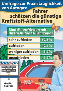 Auch im direkten Vergleich mit dem ebenfalls erhältlichen Kraftstoff Erdgas offenbaren die Umfrage-Antworten diverse Pluspunkte für Autogas, womit stets die Gas-Variante Flüssiggas gemeint ist: Neben dem Gewicht und dem Druck des jeweils erforderlichen Tanks werden zudem die niedrigeren Kosten für eine Ausrüstung sowie das dichtere Tankstellennetz als Argumente pro Autogas genannt. Zur grundsätzlich hohen Zufriedenheit mit Autogas tragen natürlich auch die schadstoffarme Verbrennung und nicht zuletzt die attraktive Vergünstigung beim Mineralölsteuersatz bei. Angesichts eines gegenüber Superbenzin um rund die Hälfte preiswerteren Literpreises ist es kein Wunder, dass durchschnittlich 93,7 Prozent aller befragten Autofahrer sich auch beim nächsten Fahrzeugwechsel wieder für Autogas entscheiden wollen.