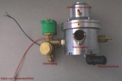 Der Verdampfer-Druckregler wandelt das flüssige Gas in den gasförmigen Zustand um. Weiterhin wird hier der Gasdruck (Einspritzdruck) geregelt. Der Verdampfer wird im Motorraum eingebaut und im Kühlsystem des Motors eingebunden (hierdurch wird eine Vereisung des Verdampfers verhindert).